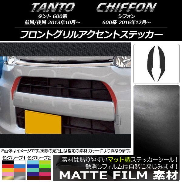フロントグリルアクセントステッカー マット調 ダイハツ/スバル タント/シフォン 600系 カスタム不可 色グループ2 入数:1セット(2枚) AP-CFMT1261 色グループ2: パープル ブラウン ボルドー マゼンタ ダークグリーン ダークブルー ライトイエロー ライトグリーン ライトブルー シアン