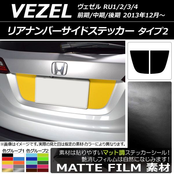 リアナンバーサイドステッカー マット調 タイプ2 ホンダ ヴェゼル RU1/2/3/4 前期/中期/後期 2013年12月〜 色グループ1 入数:1セット(2枚) AP-CFMT3442 色グループ1: ブラック ホワイト レッド ブルー イエロー オレンジ ピンク グレー ゴールド シルバー