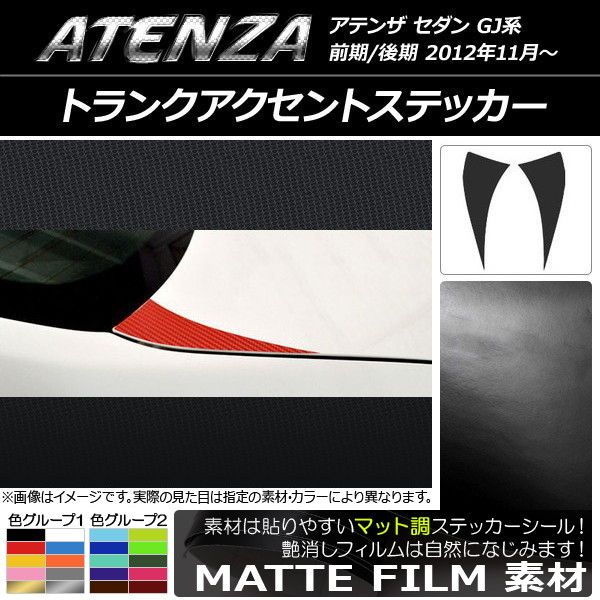 トランクアクセントステッカー マット調 マツダ アテンザセダン GJ系 前期/後期 色グループ1 入数:1セット(2枚) AP-CFMT1710 色グループ1: ブラック ホワイト レッド ブルー イエロー オレンジ ピンク グレー ゴールド シルバー