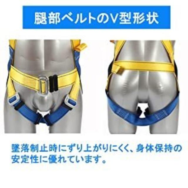 ◎墜落制止時の衝撃を骨盤全体で受け止め、身体保持の安定性に優れたV型腿ベルト