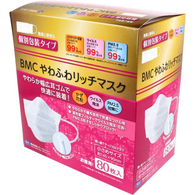 【マスク】【個装】BMC やわふわリッチマスク 使い捨てサージカルマスク 個別包装 小さめサイズ 80枚入 〈代引き・日時指定不可・沖縄/離島への配送不可〉