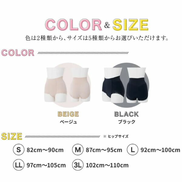 | サイズ | *ヒップサイズ* S:82〜90cm M:87〜95cm L:92〜100cm LL:97〜105cm 3L:102〜110cm |