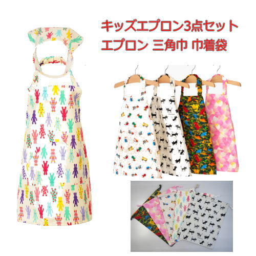 (おまかせ便で送料無料)キッズエプロン 3点セット エプロン 三角巾 巾着袋 S(100-120) M(120-140) 日本製 子供用エプロン フジキ