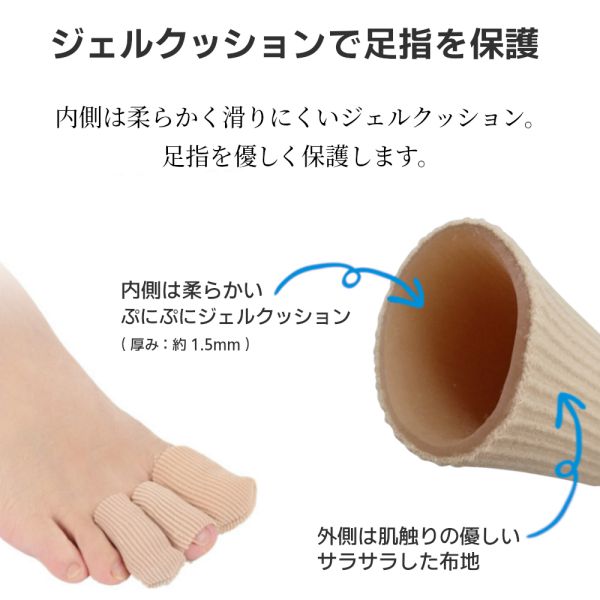 内側は柔らかいジェルクッション、外側は肌当たりの良い布地になっており、足指を優しく保護します。
