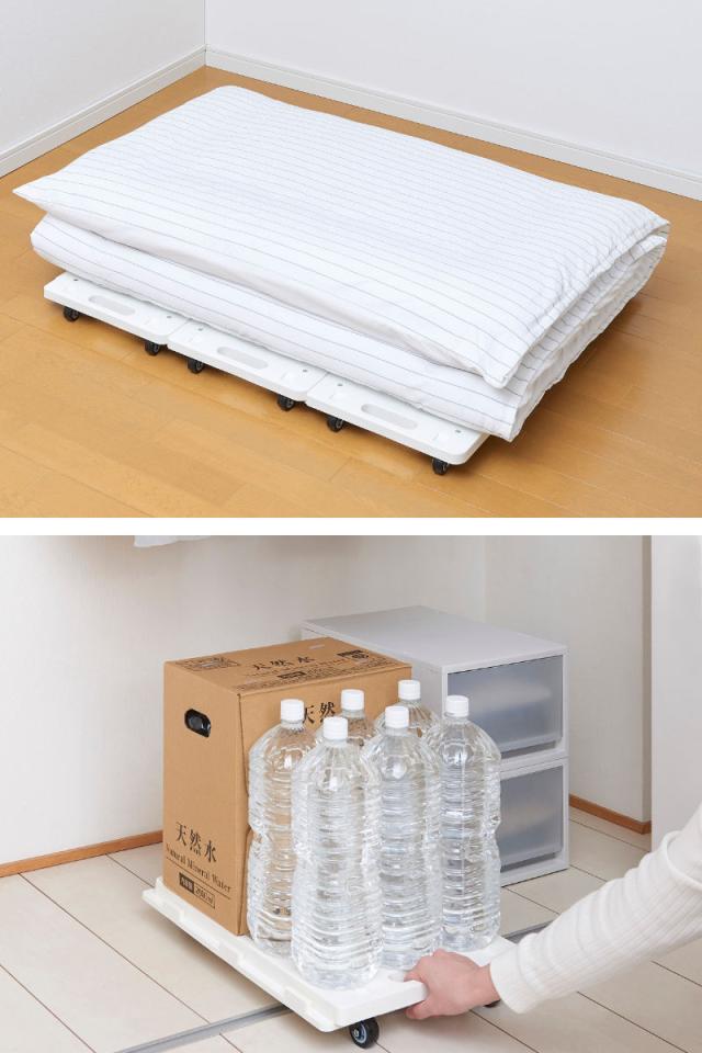 布団や季節物の家電、キャリーケース、ミシン、衣装ケースなど普段は押入れやクローゼットの中にしまい込んでいる物も、キャリーに載せて収納すれば、使用する際に簡単に取り出すことができます。また、防災用品の備蓄収納として活用すれば、もしもの時にもすぐに取り出すことができます。
