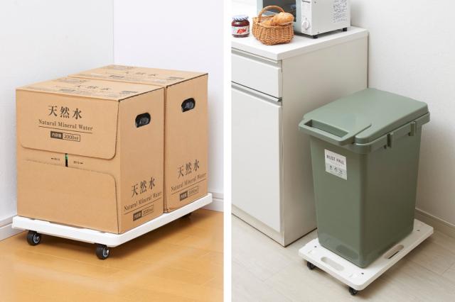 キッチンでゴミ箱や、箱買いした飲料水やお米、食品ストックの保管時にも活躍します。また、お買い物後や宅配物を玄関からキッチンまで運ぶ際にも重宝します。