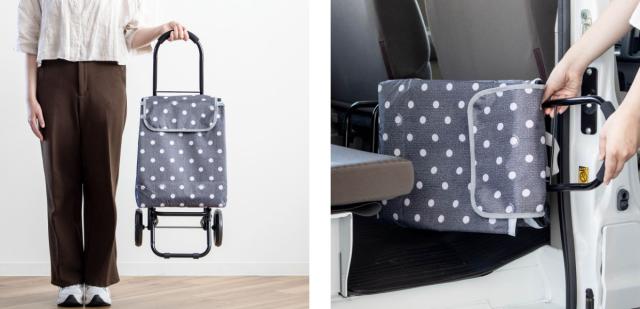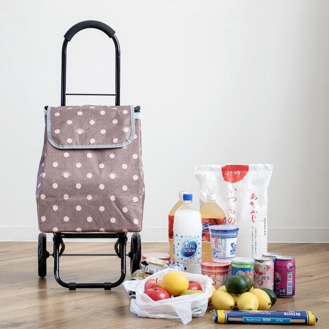ポップなドット柄がかわいらしいショッピングカートです。約28Lと大容量なので、まとめ買いした大量の荷物を収納できます。ペットボトル飲料やお米などのかさばる物を買っても安心して運べます。ちょっとしたお出かけの際も荷物をひとまとめにでき、身軽に移動ができます。