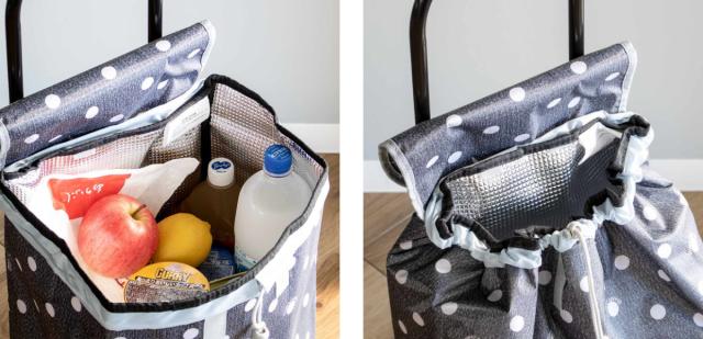 バッグの内側は全面アルミ蒸着シートを張った仕様なので、買い物した食材や飲み物も冷たさをキープしたまま持ち帰れます。さらに、バッグの口を紐で絞ることができ、保冷効果があります。また、開口部が広くて物の出し入れがしやすいです。