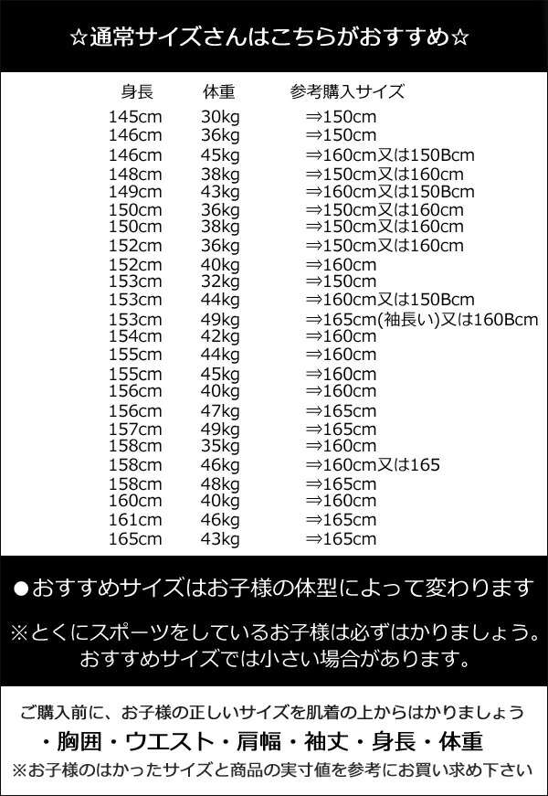 | タグ表記サイズ | 150cm 160cm 165cm ※メーカー側が設定した商品タグ、洗濯ネームに表記されているサイズとなり、 実寸サイズとは異なります。 | ||||||||||