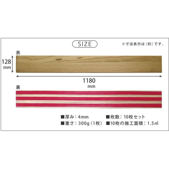■施工上のご注意:・屋内用です。屋外の壁にはお使いにならないでください。・大きな凹凸のある場所には貼れません。・漆喰壁や砂壁、土壁のようなザラザラした場所はお避けください。・コンロや暖炉のような火のまわり、またはシンクやお風呂のような水気の多い場所ではご使用にならないでください。・下地の環境により、うまく接着できない場合があります。あらかじめ作業前に目立たない場所で試し貼りしてください。また、場所によっては、接着剤との併用をおすすめいたします。・通常の壁紙の上に貼った場合、剥がす壁に壁紙も一緒に剥がれる恐れがあります。・当製品は、サーモ処理を施すことで、無垢材の特性である伸縮やねじれは通常の無垢と比較し軽減されていますが、完全に伸縮・ねじれが発生しないわけではありませんので、ご理解願います。・小さなキズやそり、色ムラなどは許容範囲とさせていただきます。商品の画像は、実物の色に近づけるようしておりますが、お客様のモニター設定、部屋の照明等により色味が異なる場合があります。