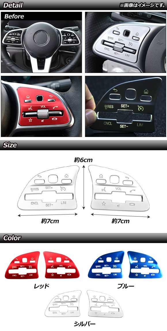 ステアリングホイールボタンカバー レッド ステンレス製 メルセデス・ベンツ 汎用 左ハンドル用 入数:1セット(2個) AP-IT1220-RD ステアリングガーニッシュ スイッチカバー スイッチガーニッシュ ハンドルスイッチガーニッシュ ファンクションスイッチカバー ファンクションスイッチガーニッシュ ■参考適合車種 MERCEDES BENZ メルセデス ベンツ A B C E CLA CLS CLASS GLBクラス GLCクラス GLEクラス GLSクラス ステアリングボタン ファンクションスイッチ マルチファンクションスイッチ ハンドルボタン ハンドルスイッチ スイッチ カバー ハンドル ステアリング パネル ボタン クローム chrome メッキ メッキパーツ ステンレス ステン 鋼 ガード ガーニッシュ リム 4570024308742 トリム ベゼル フレーム プロテクト プロテクター 傷予防 傷付き防止 内装 内装パーツ パーツ インテリア ドレスアップ カスタム カスタマイズ 装飾 アクセサリー アクセサリ アクセント 赤 red automobile motorcar オートモービル モーターカー カー 車 自動車 車両 504197970