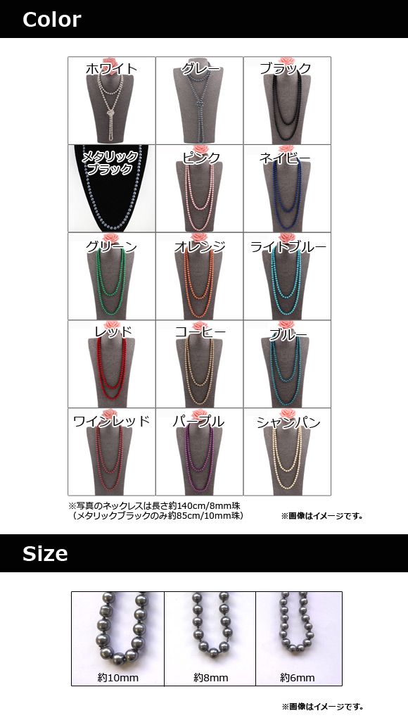 ロングパールネックレス 約150cm パールビーズ 留具なし シーンやコーディネートにあわせてアレンジいろいろ! 選べる15カラー 選べる3サイズ AP-UJ0199-150 カラー: ブラック ホワイト レッド ブルー グリーン オレンジ パープル ピンク ネイビー グレー メタリックブラック ライトブルー ワインレッド コーヒー シャンパン