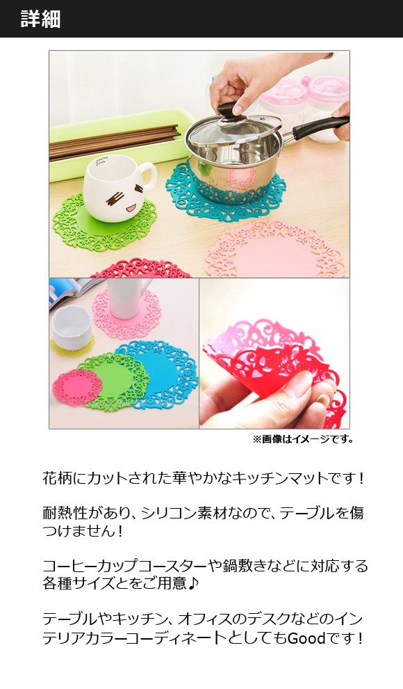 シリコンマット シリコンパッド シリコン シリコーン マット コースター 鍋敷き フライパンマット フライパン敷き カップマット プレースマット 花型コースター バラ型コースター 立体コースター 耐熱マット 耐熱コースター お食事マット ランチョンマット ランチマット 食卓マット テーブルアクセサリー テーブルデコレーション 丸洗い 汚れ防止 キズ防止 傷防止 テーブル汚れ 食べこぼし 清潔 耐久性 滑らない ソフト 柔らかい 精密加工 弾力 お手入れ簡単 キッチン テーブル 机 カラフル 花模様 リーフ模様 バラ模様 レース模様