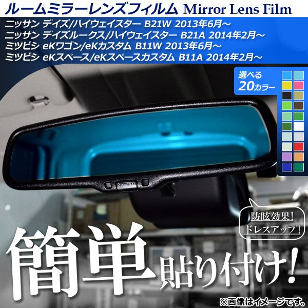 ルームミラーレンズフィルム デイズ/デイズルークス/eKスペース/eKワゴン/eKカスタム B21系/B11系 選べる20カラー AP-ML154 カラー: ブラック レッド ブルー イエロー グリーン オレンジ パープル ピンク ネイビー ブラウン クリア ダークグリーン ライトグリーン ライトブルー シアン クリアブルー クリアグレー シャンパン イエローグリーン クリアグリーン