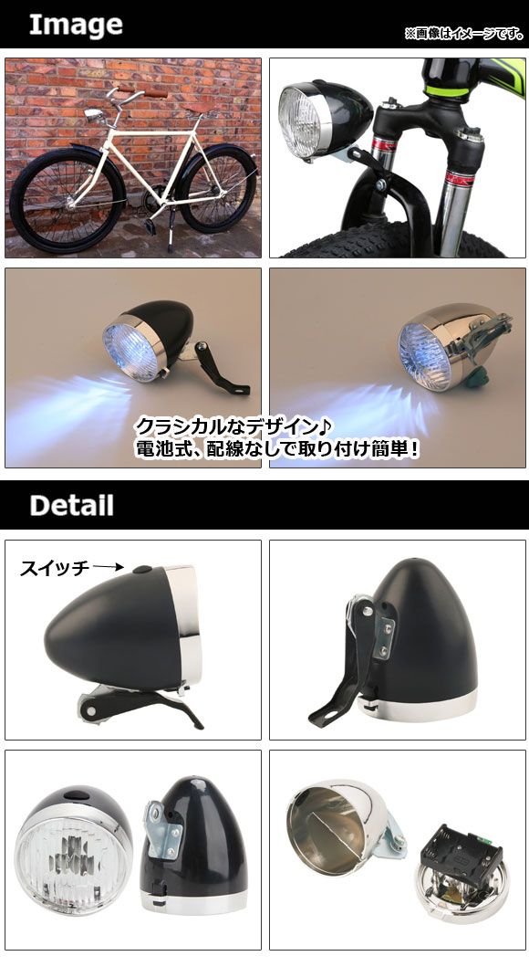 LEDヘッドライト 自転車用 砲弾型 クラシカルなデザインでオシャレ♪ 選べる2カラー AP-UJ0559 2輪