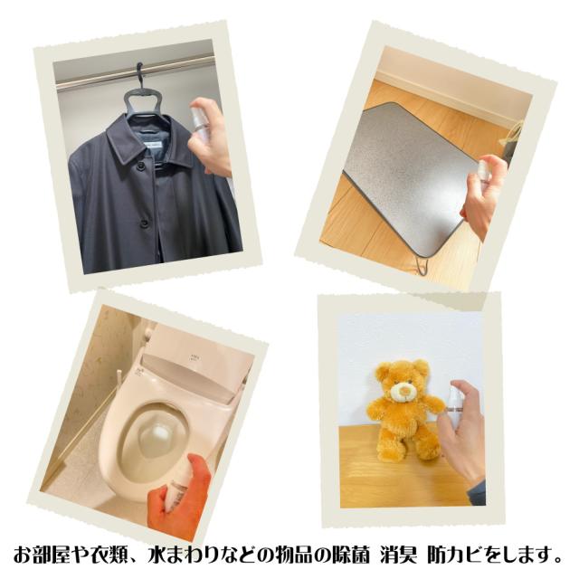 テーブルやドアノブ、手すりなどのお部屋周りや衣類・マスクなど日用品の除菌剤としてお使い頂けます。
