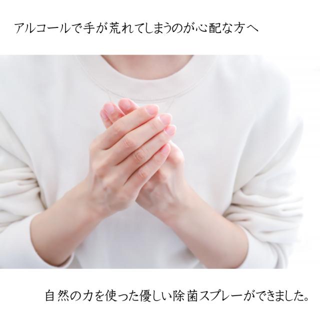 アルコールで手が荒れてしまうのが心配な方、自然の力を使った優しい除菌スプレーができました。