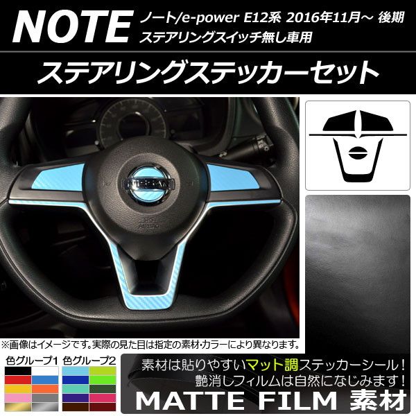 ステアリングステッカーセット マット調 ニッサン ノート/ノートe-power E12系 後期 ステアリングスイッチ無し車用 2016年11月〜 色グループ1 AP-CFMT3334 色グループ1: ブラック ホワイト レッド ブルー イエロー オレンジ ピンク グレー ゴールド シルバー