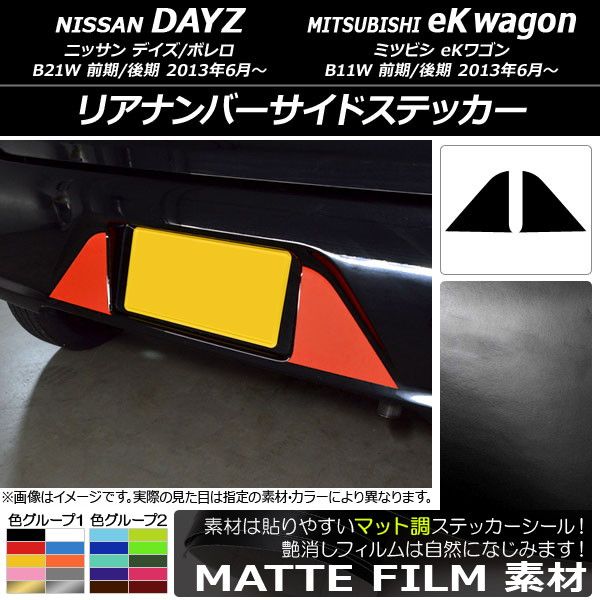 リアナンバーサイドステッカー マット調 ニッサン/ミツビシ デイズ/ボレロ/eKワゴン B21W/B11W 色グループ2 入数:1セット(2枚) AP-CFMT3678 色グループ2: パープル ブラウン ボルドー マゼンタ ダークグリーン ダークブルー ライトイエロー ライトグリーン ライトブルー シアン