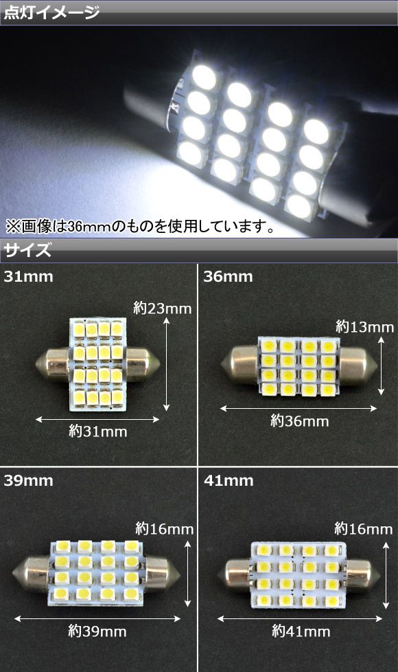 454219890 ルームランプ ルームライト LED LEDバルブ バルブ 車内灯 室内灯 16発 16灯 16個 白 ヒューズ球 タル型 樽型 両口金 まくら球 枕球 枕型球 枕型 ランプ ライト 照明 電球 電灯 発光 ルーム センター マップ バニティ バニテイ バイザー カーテシ フット ラゲッジ トランク フロント automobile motorcar オートモービル モーターカー カー 車 自動車 サイズ T10×31mm T10×36mm T10×39mm T10×41mm 31MM 31ミリメートル 36MM 36ミリメートル 39MM 39ミリメートル 41MM 41ミリメートル AP-SINA-LED009-T1031 AP-SINA-LED009-T1036 AP-SINA-LED009-T1039 AP-SINA-LED009-T1041 4562430370673 4562430370680 4562430370697 4562430370703
