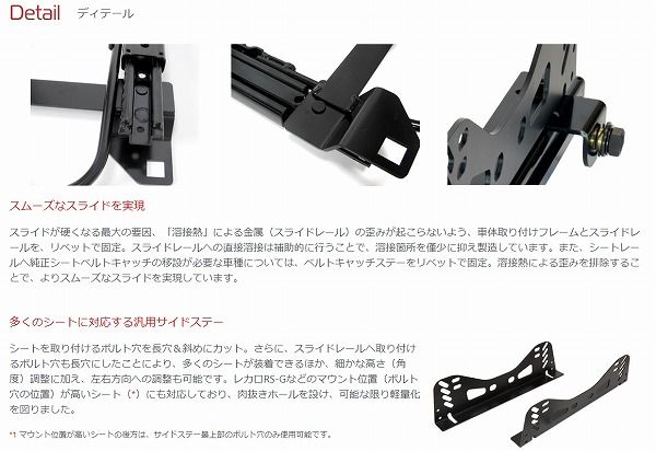 シートを取り付けるボルト穴を長穴&斜めにカット。さらに、スライドレールへ取り付けるボルト穴も長穴にしたことにより、多くのシートが装着できるほか、細かな高さ(角度)調整に加え、左右方向への調整も可能です。レカロRS-Gなどのマウント位置(ボルト穴の位置)が高いシートにも対応しており、肉抜きホールを設け、可能な限り軽量化を図りました。