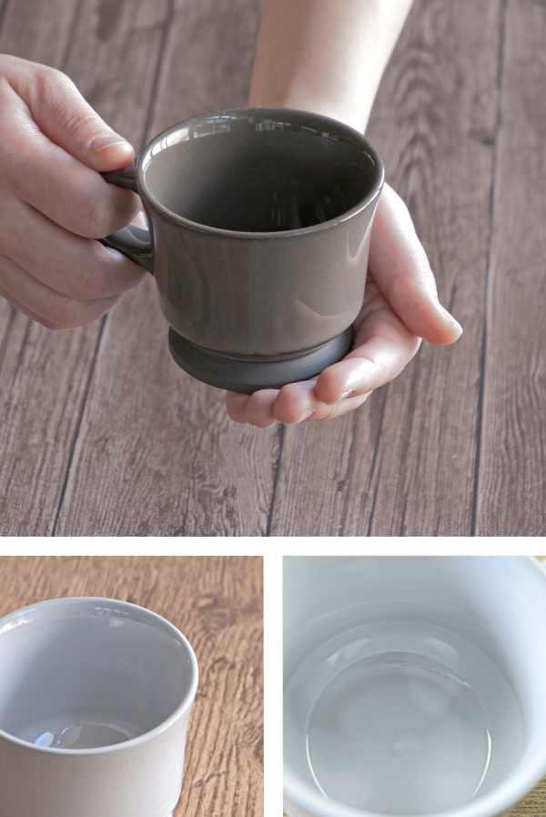 表面のつるりとした艶が美しく、手に馴染みやすいです。ブラウンの高台部分だけあえて光沢を抑えざらざらとした手触りになっています。また、女性の指が1本入るサイズの取っ手が付いています。