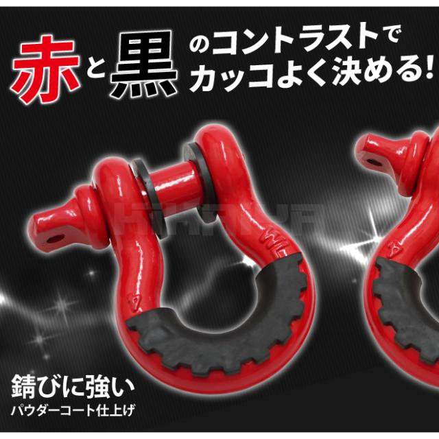 赤と黒でカッコよく決める! ●汎用バウシャックルのセットです ●カーアクセサリーとして赤と黒のコントラストでカッコよくドレスアップ! ●荷重4750kgまでのウインチ作業にもご使用いただけます ●シャックルは錆びに強いパウダーコート仕上げ ●シャックルアイソレーターを装着することでシャックルを磨耗や劣化から保護します ●シャックルワッシャーは走行時のがたつきや音の防止になります 品番:BOSR |