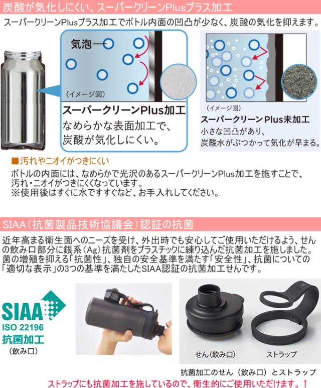 いつでもどこでも冷たい炭酸飲料を持ち運べる真空断熱ボトル ペットボトルのような結露がなく、冷たさと炭酸を長時間キープしてくれます。 ビールやアルコールを入れることもできるので様々なシーンで活躍します。 炭酸ガスの噴き出しを防ぎ開けやすい「ガス抜き機構」と内圧の高まりに対応する「安全弁」を備えたメーカー独自のBubble Logic(バブルロジック)を採用。 噴き出しや飛び散りを防ぐことにより、冷たくてフレッシュな炭酸を持ち運びできるようになりました。 ボトルの内面になめらかで光沢のあるスーパークリーンPlusプラス加工を施すことにより、内面に凹凸のあるボトルに比べて、炭酸の気化を抑えることが可能です。 「抗菌加工せん・キャップ」で外出時でも安心してご使用していただけます。 飲み口がはずして洗え、本体も丸洗いできるので清潔にお使いいただけます。 ■水筒・マグボトルはこちら↓ 水筒・マグボトル一覧 |