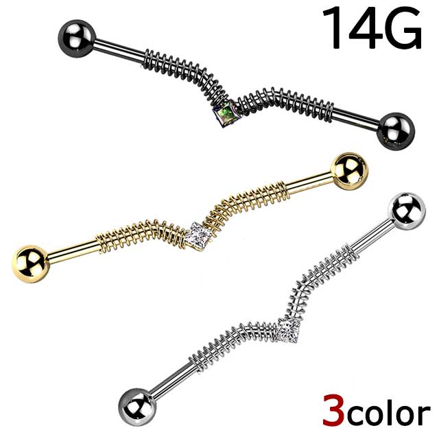 ボディピアス 14G インダストリアル スプリングコイル スクエア センタージェム ストレートバーベル [ 軟骨ピアス 耳ピアス ヘリックス 316L サージカル ステンレス ]