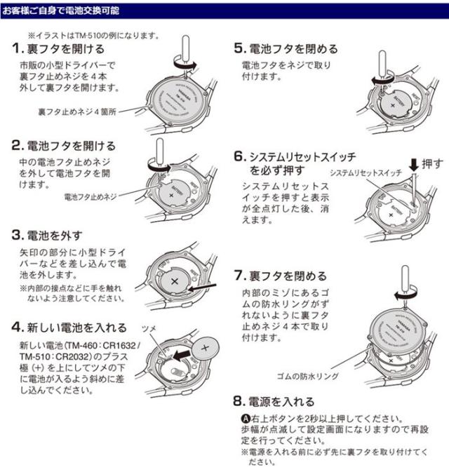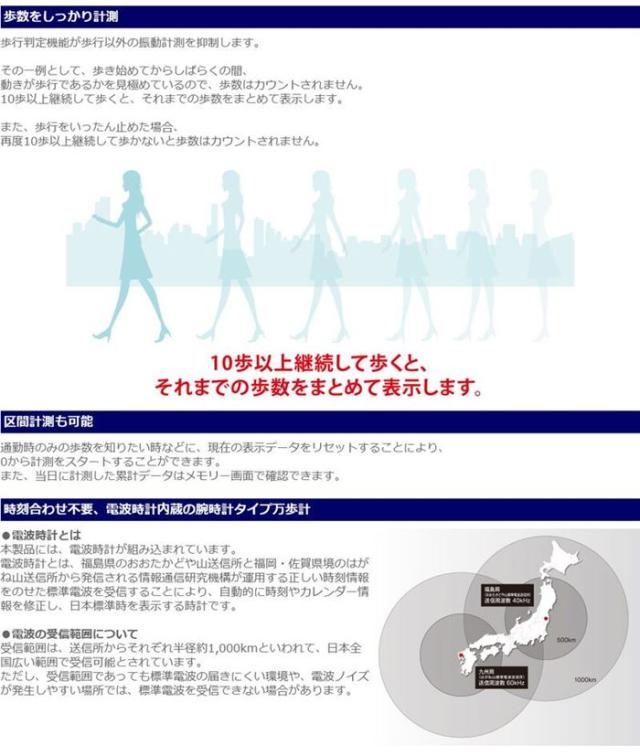 ●電波時計内蔵の腕時計タイプ万歩計 ●3D加速度センサー搭載で、左右どちらの手首につけても計測可能 ●表示が大きく、見やすいレギュラーモデル ●歩数、歩行距離、消費カロリー、歩行時間、時刻、 カレンダーを表示 ●30日分のデータをメモリー ●1秒単位のストップウォッチ機能搭載 ●雨・手洗いの際の水しぶきに耐えられる3気圧防水(日常生活防水) ●歩行判定機能が歩行以外の振動計測を抑制 ●お客様ご自身で電池交換可能