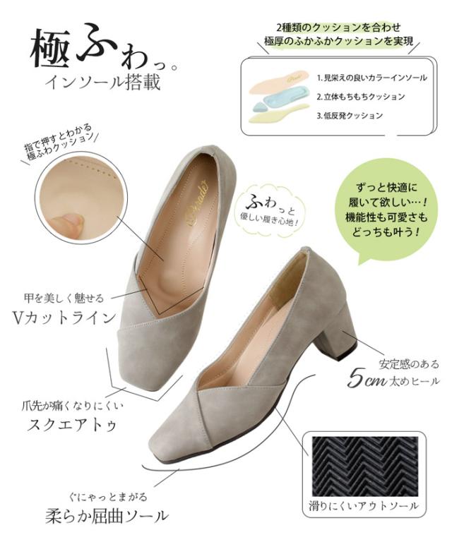 衝撃性、弾力性、復元性、前滑り、ブレを防止する機能性バツグンの成形型アーチインソールを搭載し、もっちりフワフワなインソールクッションを採用した極ふわパンプス。長時間でも分厚いクッションが足を労ってくれます。ヒールは太めでしっかり安定します。プレーンより使える?!新定番パンプスです。