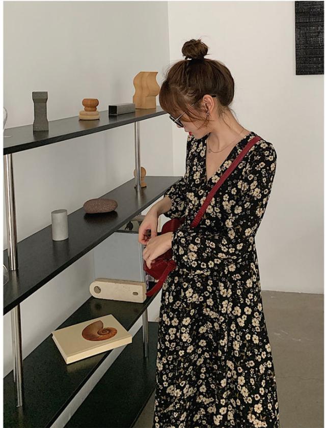 ◎小花柄のシフォンワンピースで、落ち着いた色味だけど総柄で女性らしい印象です。