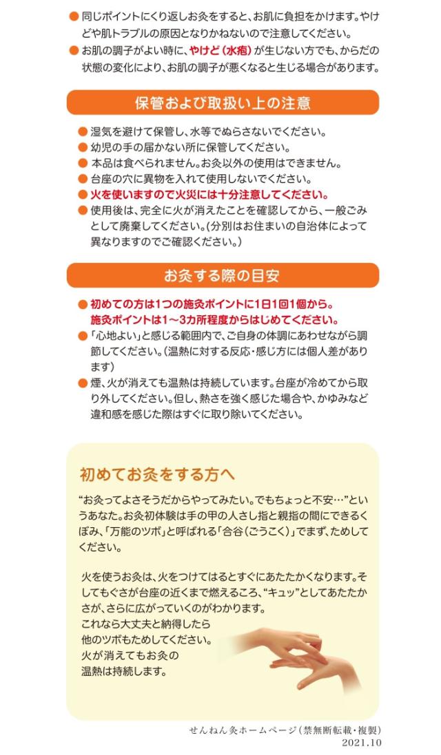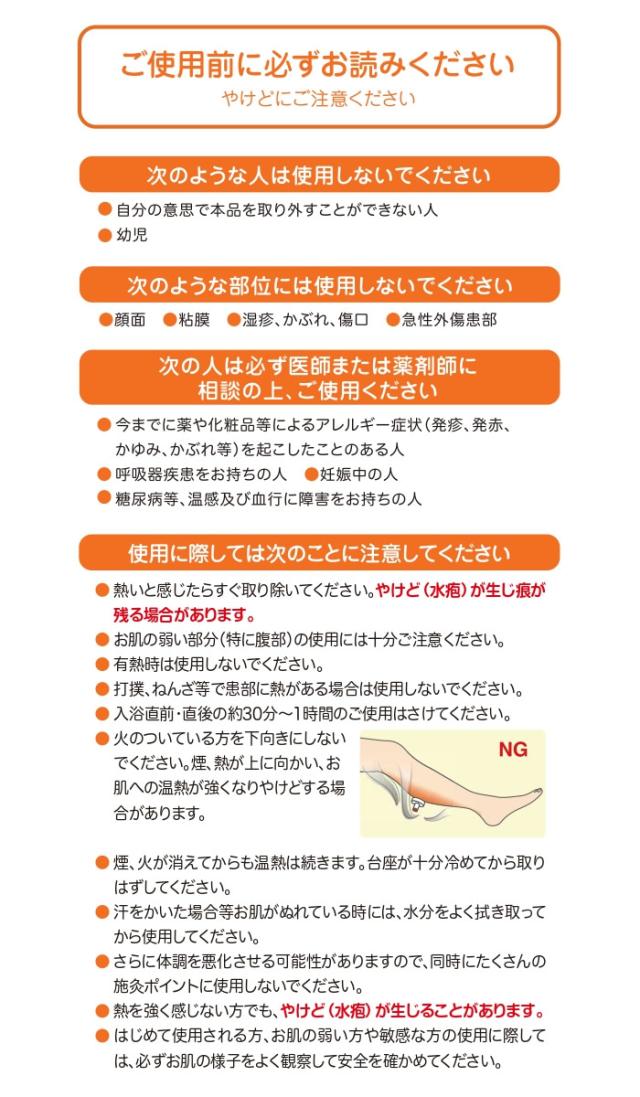 | 使用上の注意 | ・お灸に熱刺激はなくてはならないものです。やけどには十分にご注意ください。 ・熱さを強く感じたり熱さが不快なときは我慢せず取り除いてください。やけど(水疱)が生じ痕が残る場合があります。 ※台座があついのでご注意ください。 ・「体質」「健康状態」「身体の部位」「気温・湿気」「気候」などの違いによって温熱の感じ方に変化が生じますのでご注意ください。 |
