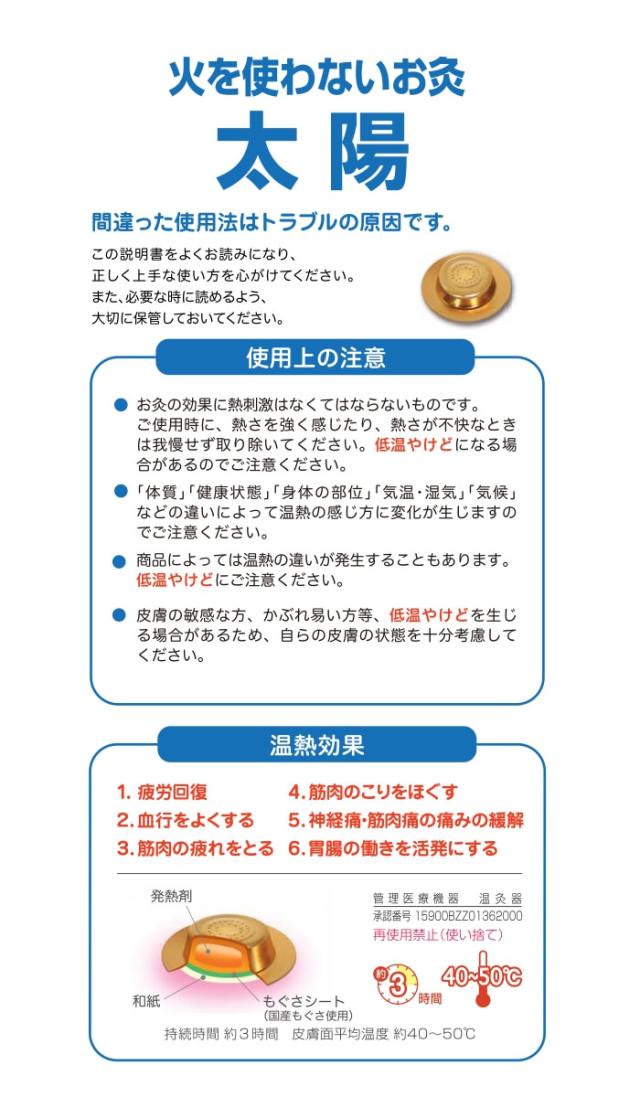| 使用方法 | 外装シールより火を使わないお灸 太陽を取り出し、上部(凸部)のシールと皮膚面(底部)のシールをはがし患部にはってください。 |