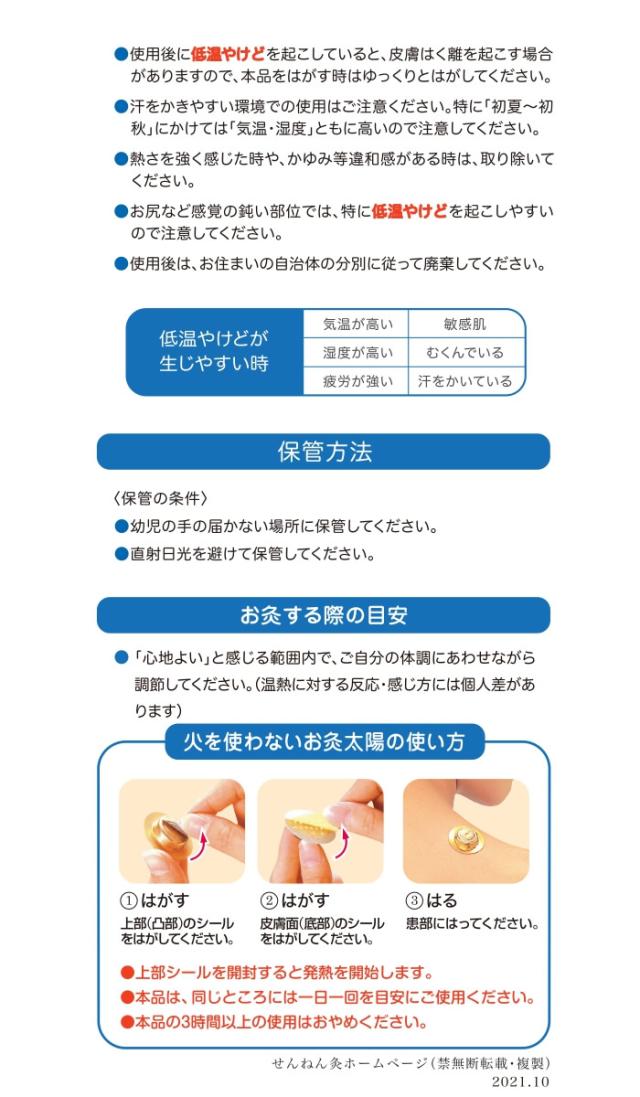 | 使用上の注意 | ・お灸の効果に熱刺激はなくてはならないものです。ご使用時に、熱さを強く感じたり、熱さが不快なときは我慢せず取り除いてください。低温やけどになる場合があるのでご注意ください。 ・「体質」「健康状態」「身体の部位」「気温・湿気」「気候」などの違いによって温熱の感じ方に変化が生じますのでご注意ください。 ・商品によっては温熱の違いが発生することもあります。低温やけどにご注意ください。 ・皮膚の敏感な方、かぶれ易い方等、低温やけどを生じる場合があるため、自らの皮膚の状態を十分考慮してください。 |