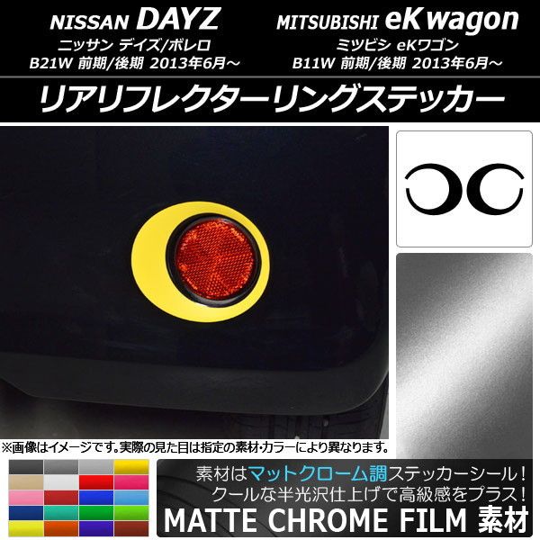 リアリフレクターリングステッカー マットクローム調 ニッサン/ミツビシ デイズ/ボレロ/eKワゴン B21W/B11W 選べる20カラー 入数:1セット(2枚) AP-MTCR3690 カラー: ブラック ホワイト レッド ブルー イエロー グリーン オレンジ パープル ピンク ネイビー ブラウン ボルドー ゴールド シルバー ガンメタリック マゼンタ ライトグリーン ライトブルー ライトゴールド シアン