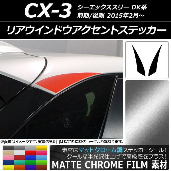 リアウインドウアクセントステッカー マットクローム調 マツダ CX-3 DK系 前期/後期 2015年02月〜 選べる20カラー 入数:1セット(2枚) AP-MTCR3204 カラー: ブラック ホワイト レッド ブルー イエロー グリーン オレンジ パープル ピンク ネイビー ブラウン ボルドー ゴールド シルバー ガンメタリック マゼンタ ライトグリーン ライトブルー ライトゴールド シアン