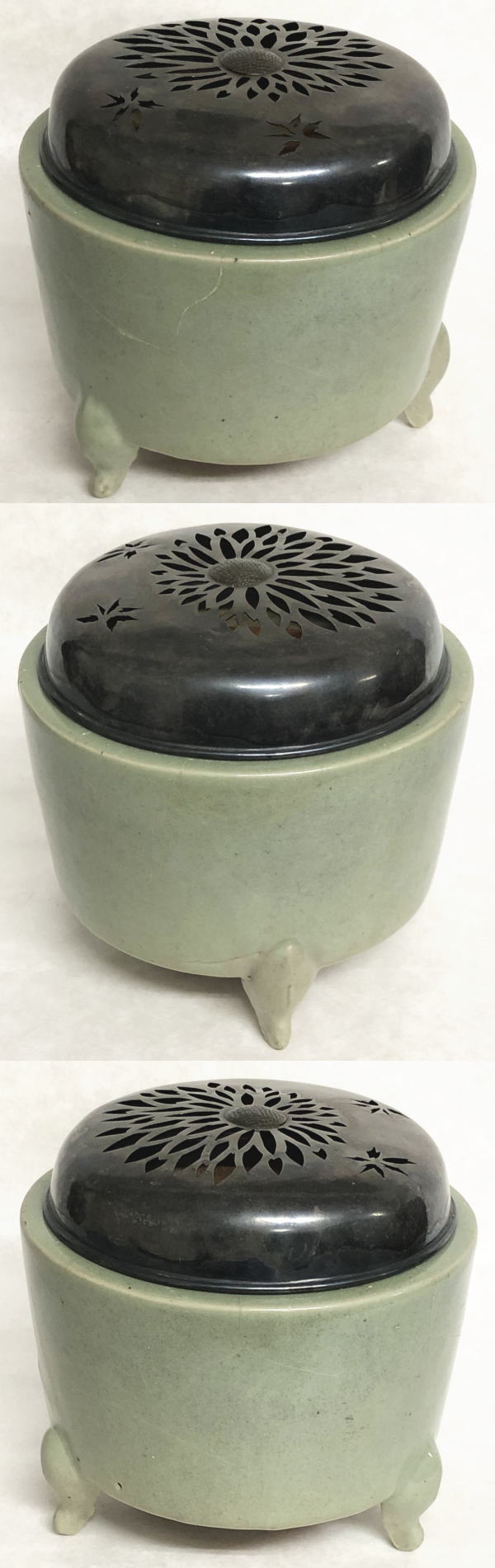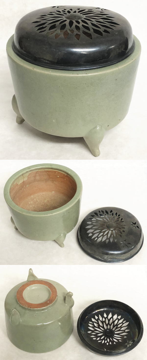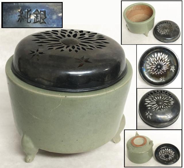 【送料無料】古青磁大香炉 純銀火屋付約174g 修復あり 茶道 香道 陶器 磁器 細密細工 古美術品 骨董 細密細工 (旧家蔵出し) 威龍彩雲