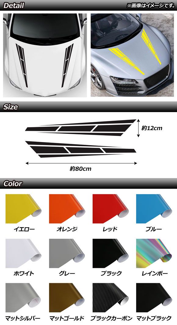 ボンネットステッカー 汎用 選べる12カラー 入数:1セット(2枚) AP-XT569 カラー: ブラック ホワイト レッド ブルー イエロー オレンジ グレー レインボー ブラックカーボン マットシルバー マットブラック マットゴールド