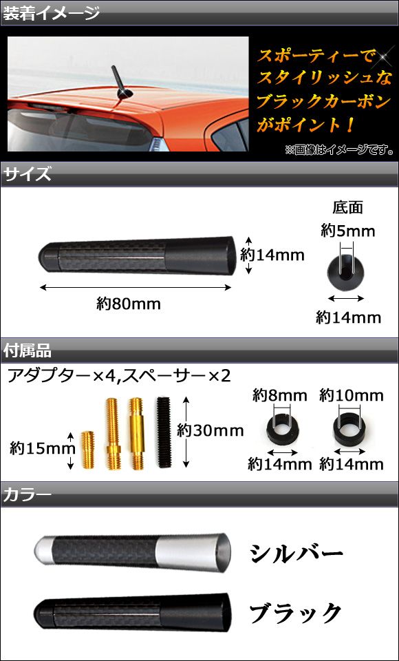 450505350 シルバー AP-ATENA-B-SI ブラック AP-ATENA-B-BK 4562430222613 4562430222620 アンテナ ラジオアンテナ ルーフアンテナ 汎用 ラジオ ドレスアップ 銀 SILVER 黒 BLACK 車 カー用品 外装 パーツ 部品 カースタイリング カスタム シムーレスカーボン カーボン柄 ブラックカーボン 80ミリ 8cm 8センチ automobile motorcar オートモービル モーターカー カー 自動車 車両 カラー