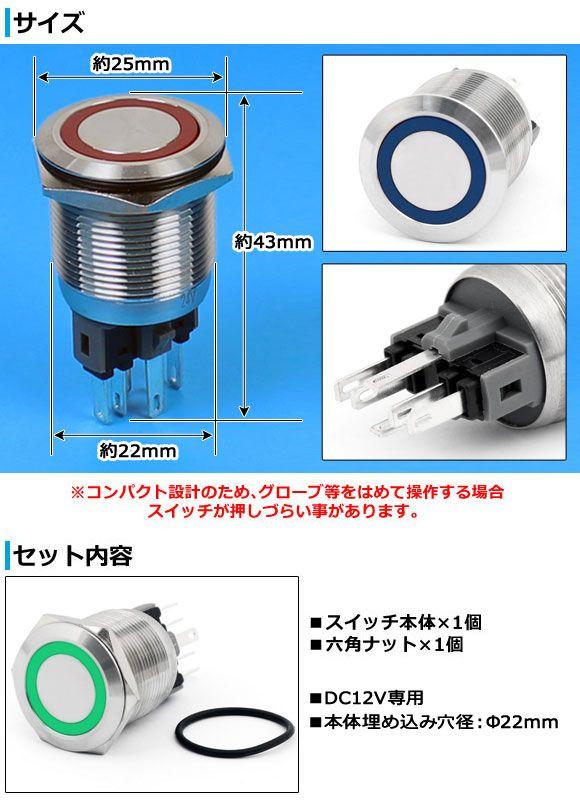 LEDリングイルミネーション LEDリングイルミ LEDイルミネーションリング リング プッシュ スイッチ ボタン ホーンスイッチ ホーン 電源スイッチ 電源ボタン モーメンタリ モーメンタリー ロック無し リバース リバース式 ON OFF オン オフ ステンレス 通電 導通 イルミ イルミネーション 埋め込み 照光 発光 点灯 汎用 22mm 薄型 小型 コンパクト