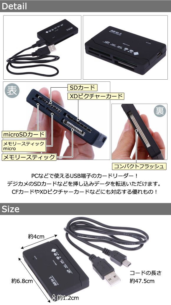 USB カード リーダー メディアリーダー アダプタ コネクタ PC パソコン SD SDカード SDメモリ メモリースティック メモリースティックDuo メモリ microSD マイクロSD MMC MS TF PRO DUO CF コンパクトフラッシュ XDピクチャーカード XD フラッシュメモリ USBメモリ マウス キーボード カメラ デジカメ ビデオ インストール 携帯 モバイル スマートフォン スマホ テレビ TV 動画 写真 データ転送 データ 転送 接続 変換 取り込み