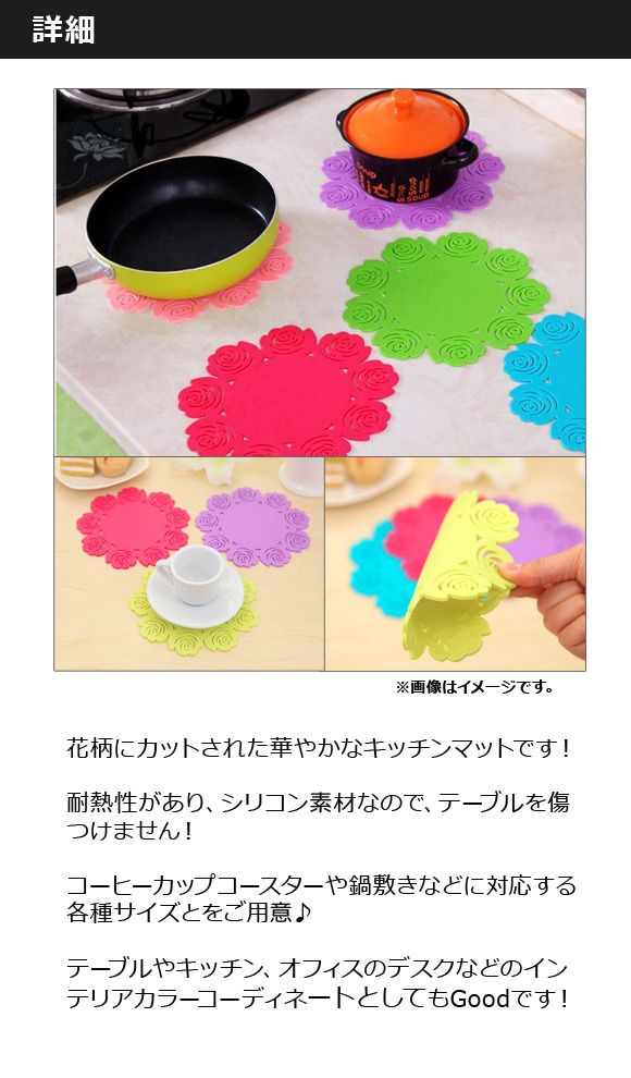 シリコンマット シリコンパッド シリコン シリコーン マット コースター 鍋敷き フライパンマット フライパン敷き カップマット プレースマット 花型コースター バラ型コースター 立体コースター 耐熱マット 耐熱コースター お食事マット ランチョンマット ランチマット 食卓マット テーブルアクセサリー テーブルデコレーション 丸洗い 汚れ防止 キズ防止 傷防止 テーブル汚れ 食べこぼし 清潔 耐久性 滑らない ソフト 柔らかい 精密加工 弾力 お手入れ簡単 キッチン テーブル 机 カラフル 花模様 リーフ模様 バラ模様 レース模様