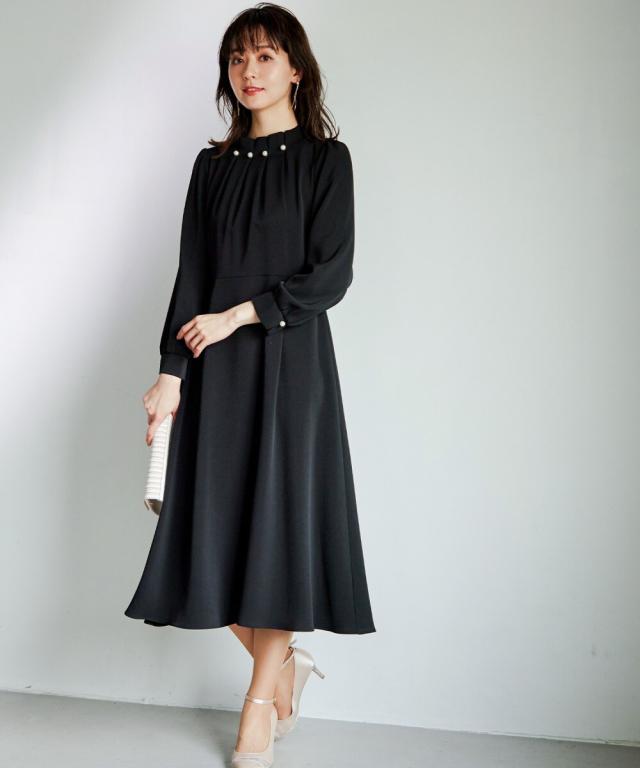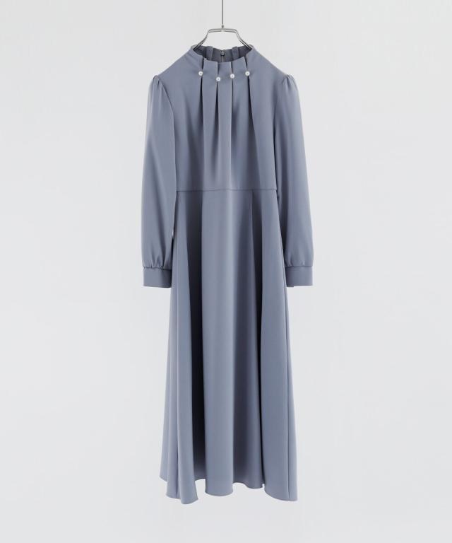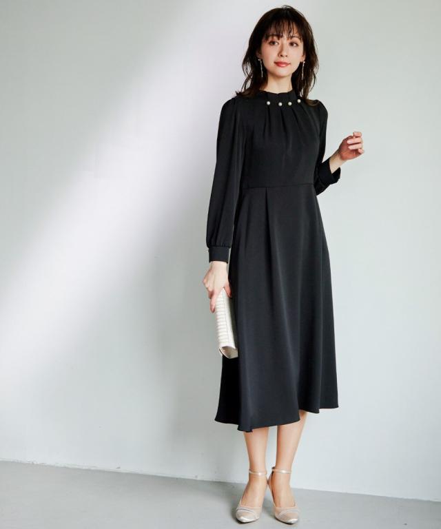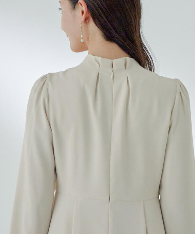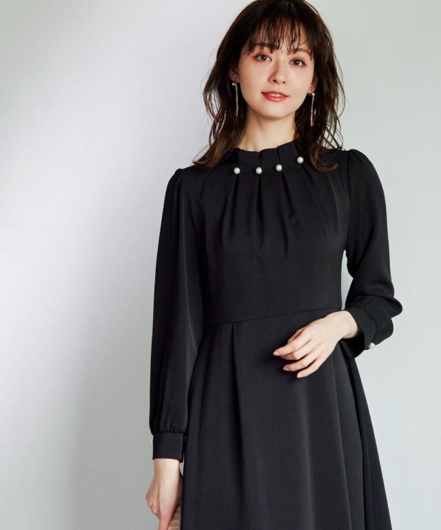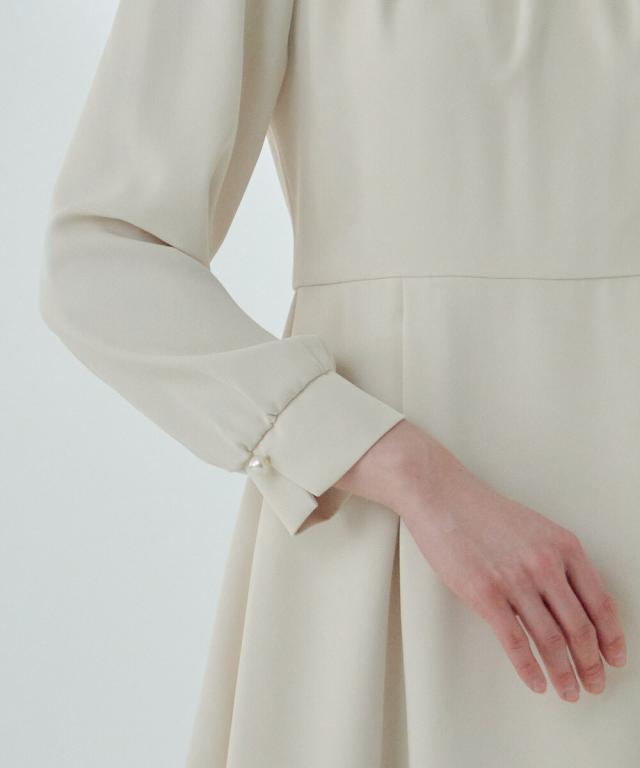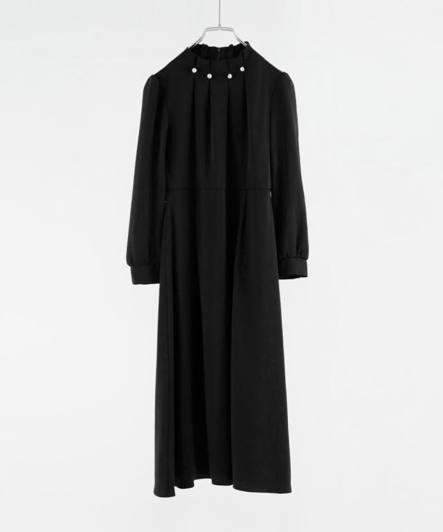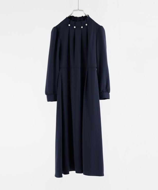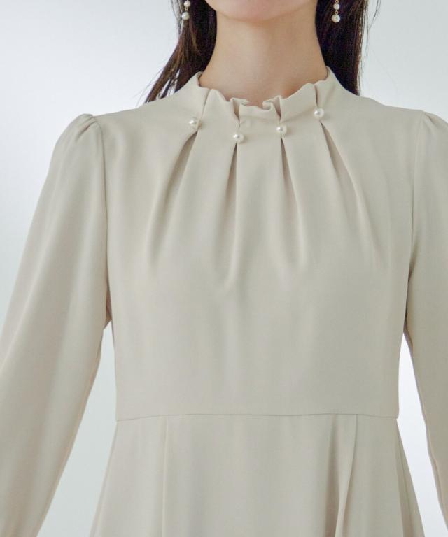 ネックラインにパールを並べたタックワンピース。