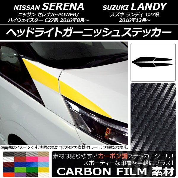 ヘッドライトガーニッシュステッカー 日産/スズキ セレナ/ランディ C27系 カーボン調 選べる20カラー 入数:1セット(4枚) AP-CF3830 カラー: ブラック ホワイト レッド ブルー イエロー グリーン オレンジ パープル ピンク ネイビー ブラウン ボルドー クリア ゴールド シルバー ガンメタリック マゼンタ ダークグリーン メタリックブルー ライトブルー