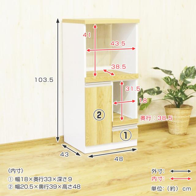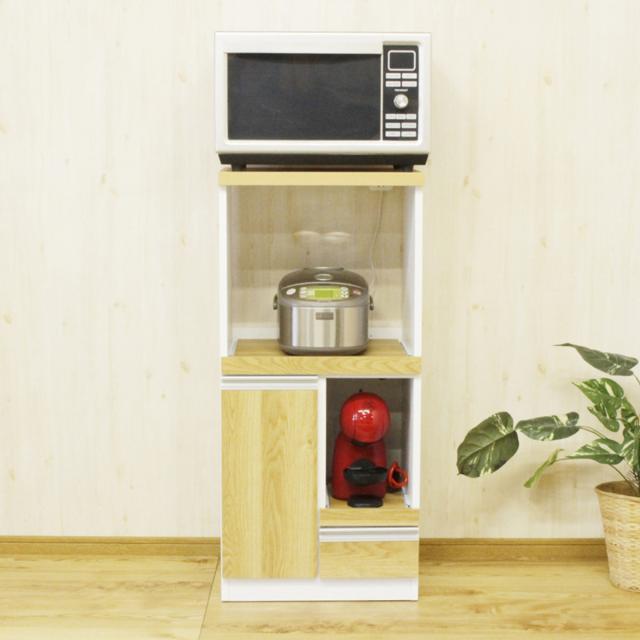 レンジ台 スライドカウンター 扉付 コンパクト 木目調 幅48cm ( キッチンラック キッチンボード キッチン収納 コンセント付き 日本製 完成品 家電収納 レンジラック 台所収納 ホワイト ナチュラル 国産 収納ラック )