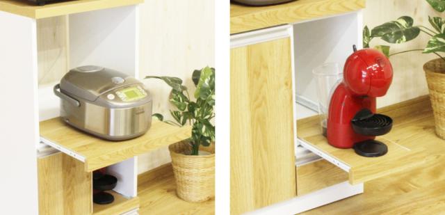 大と小のスライドテーブル付きです。省スペースで家電を収納でき、蒸気が出る炊飯器やケトルなどを使用する際は引き出して安全にお使いいただけます。