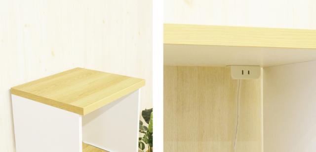 | レンジや小物が置ける天板 耐荷重20kgの天板です。レンジはもちろん小物や雑貨なども置けます。 | 1口コンセント付き カウンター部分には1口コンセント付きです。 |