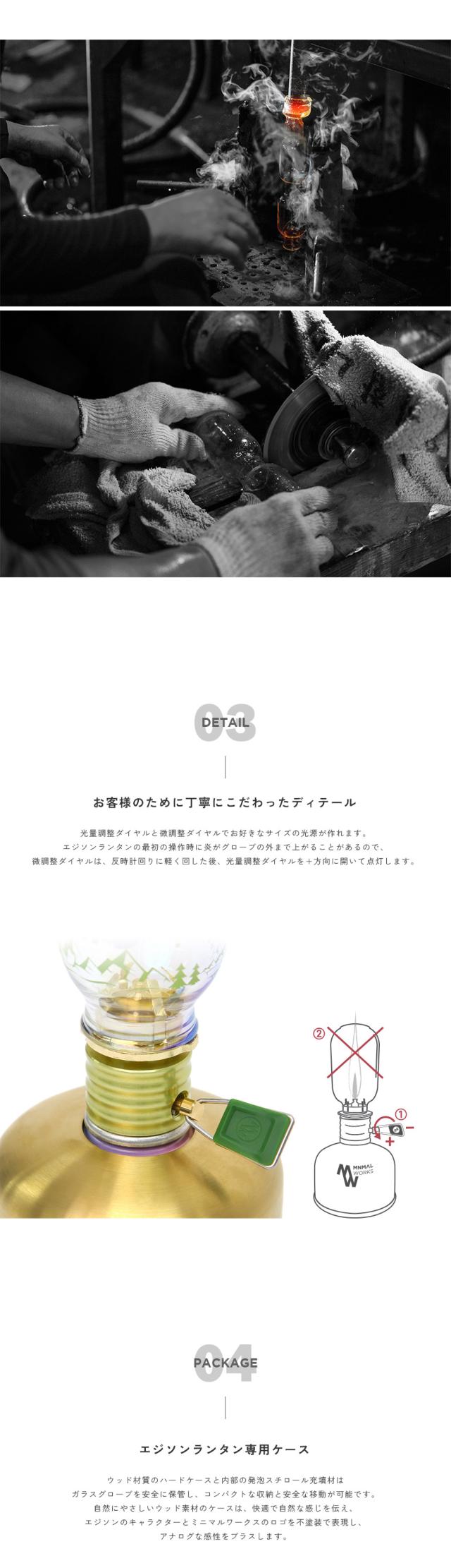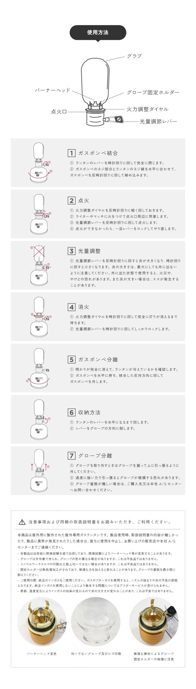 UNBY株式会社(unby.jp)はMINIMAL WORKSの日本総代理店です。※ガラスグローブは1点1点手作業での生産のため、個体差がございます。予めご了承のうえご注文ください。ドイツから輸入した円筒形のガラス管を職人が手作業で制作し、グローブを固定するホルダーは金属で制作して耐久性を高めました。機械式で生産された製品と比較すると、やや粗削りに見えるかもしれませんが、ミニマルワークスのエジソンランタンは、エジソン電球ならではのアナログ感性とエジソンの情熱を込めるために努力しました。※ガス缶は別売です。
