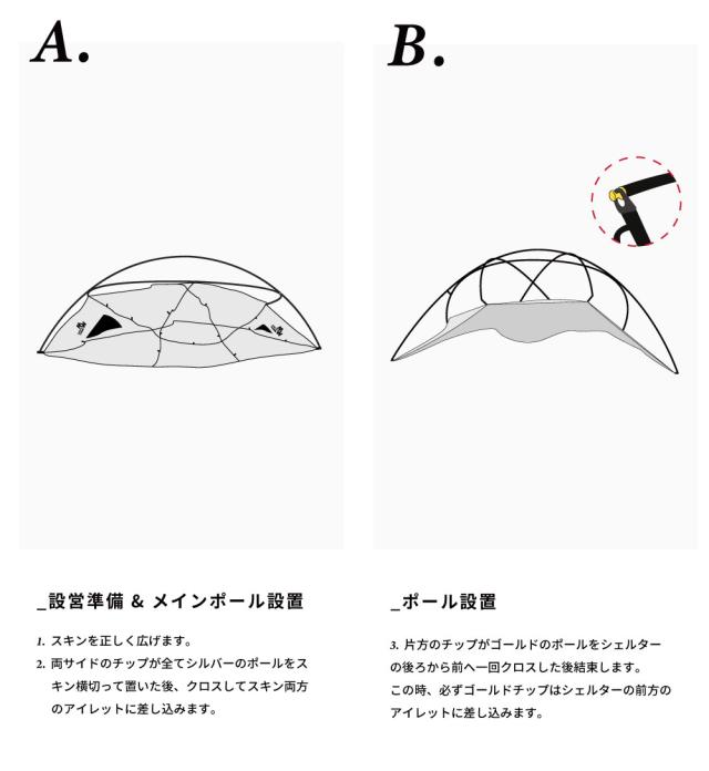 2つのポール(2本連結式)で構成されたグラマーシェルターは初心者でも簡単&素早く組み立てが可能です。